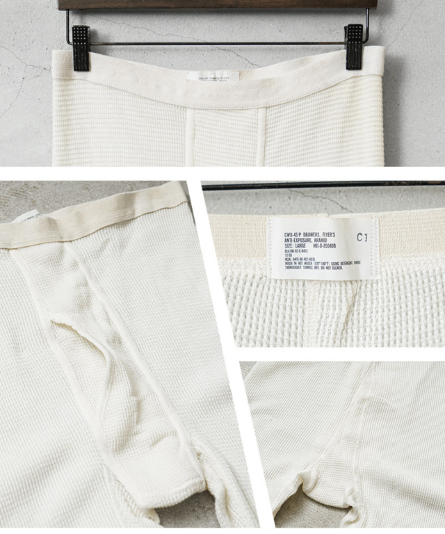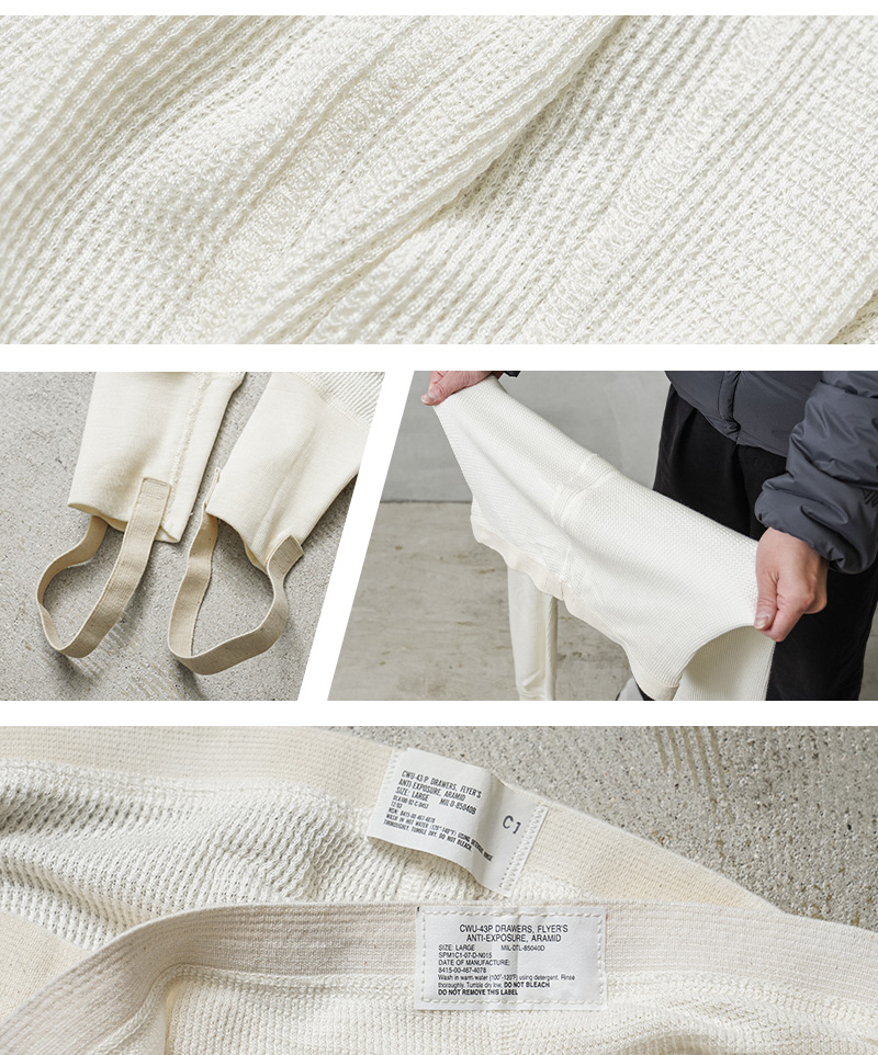 | 商品説明 | 実物 新品 デッドストック 米軍 U.S.A.F. CWU-43 / P フライヤーズ アラミド アンダーパンツ の紹介です。 制式名称:CWU-43 / P DRAWERS, FLYER'S ANTI-EXPOSURE, ARAMID 米空軍のエアクルー用のアラミド(NOMEX)アンダーパンツが登場です。 素材には実際のフライト任務を想定して開発された、難燃のアラミドを使用。サーマルを採用した生地は、肌当たりよく、軽量で保温性も高く、アンダーパンツとして最大限の効果を発揮します。 体の形に沿って立体的に作られた圧迫感のないフロント部分。ウエストはゴムで伸縮し、フィット感はありつつ締めつけ感のない裾の切り替えデザイン。機能的な生地に加え、ストレスのない履き心地を実現する造りになっています。また裾には足裏に掛けるスティラップを備えており、着用時のずり上がりを防ぎ、ブーツインでも安定したフィット感を保ちます。 ウィンタースポーツ、登山など冬場の防寒対策としてや普段着にデイリーに活躍する他、家でのリラックスウェアとしてもオススメのアイテムです。 |