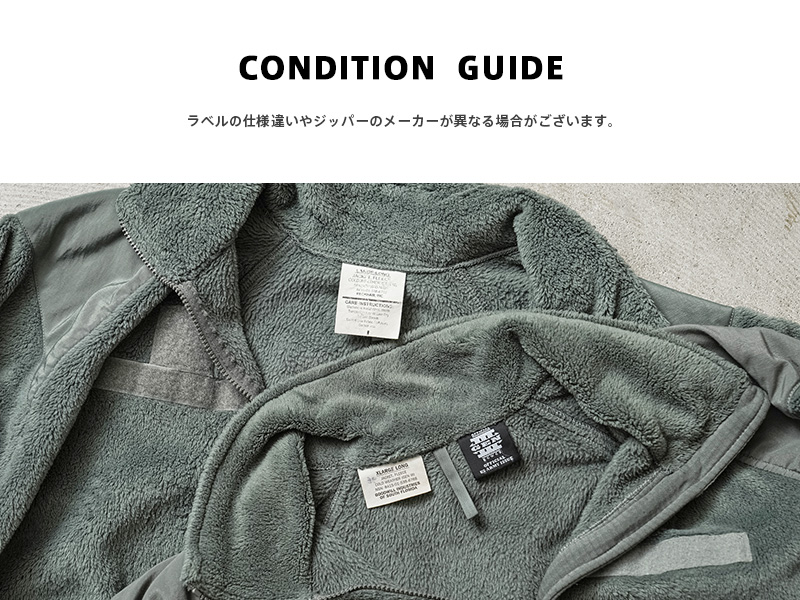 | 商品状態 | 軍放出USEDのリメイク品 ※USED商品のため1点1点使用感や状態は異なり、正方形のベルクロの位置が左右異なる場合がございます。また、小さなリペアが施されている場合があり、着用時には見えない内側襟元などにマジックでのマーキング、内側に毛玉、経年や使用による毛質の変化や縮みによる若干の寸法の誤差などがある場合がございます。いずれもさほど目立たず、着用にもまったく支障はございませんが、商品の状態についてご指定いただくことは出来ませんので予めご了承ください。 ※POLARTEC(ポーラテック)のタグが裏向きにつけてあったり、欠損している場合がございます。タグのデザインも異なる場合もございます。また、コントラクトタグ(サイズタグ)の欠損、ラベルの仕様違いやジッパーのメーカーが異なる場合がございます。マーキングまたは多少の損傷がある場合がございます。予めご了承ください。 ※商品によってジッパープルのコード(紐)がない場合がございます。ご指定を承ることはできませんので、予めご了承下さい。 |
