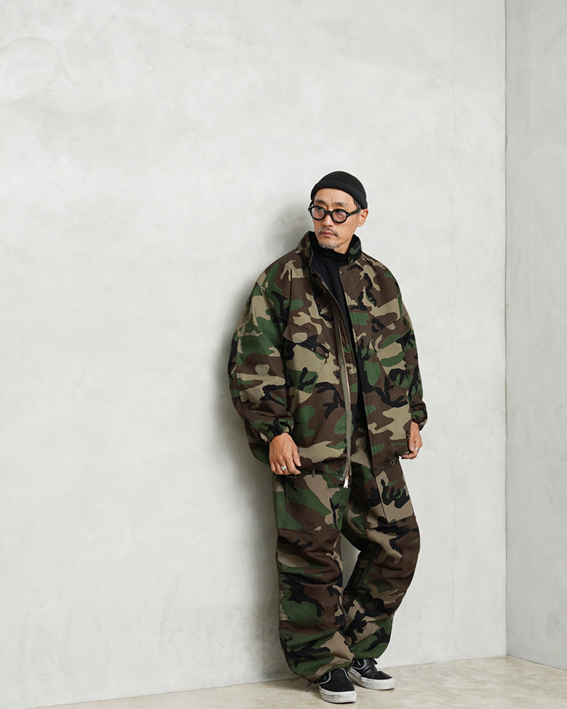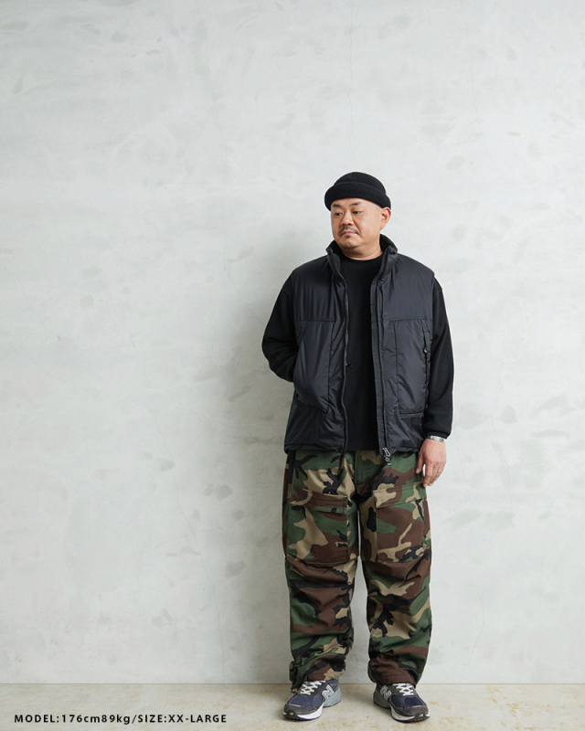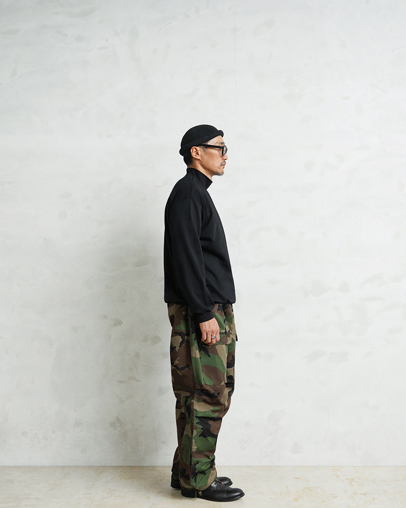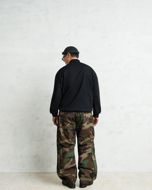 衣類の上から着用することを目的に製造されていますのでゆったりとしたシルエットで、フロントにベルクロ開閉のカーゴポケットが備わった特徴的なデザインがファッション的に見てもデザイン性の高く、膝には2箇所のタックがデザインされており、広い可動域を確保。裾部分には45cm以上のジッパーが備わっており、靴を履いたまま素早い着脱ができるようにデザインされており、ブラスジッパーはベルクロで保護されています。