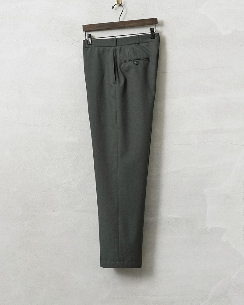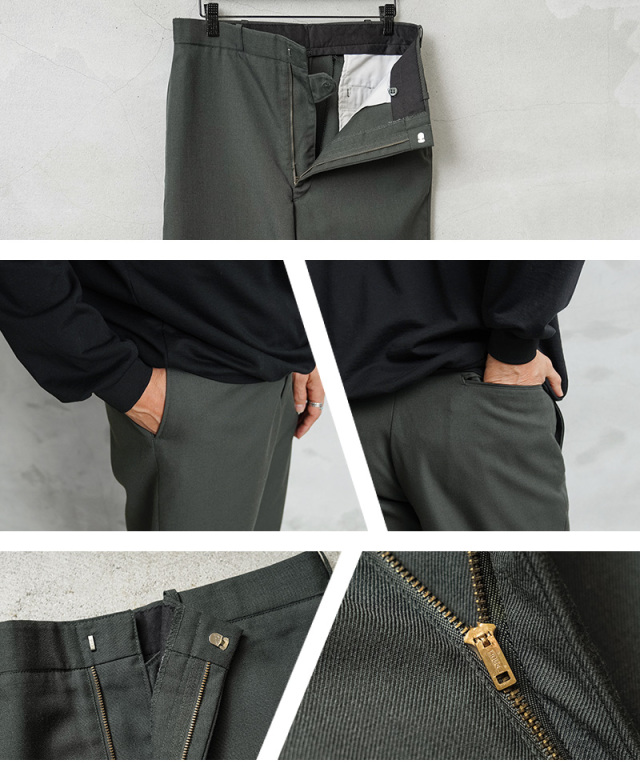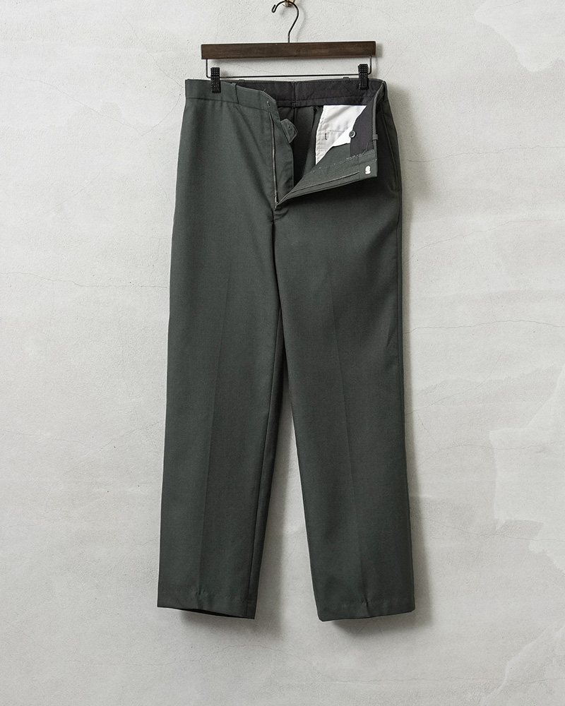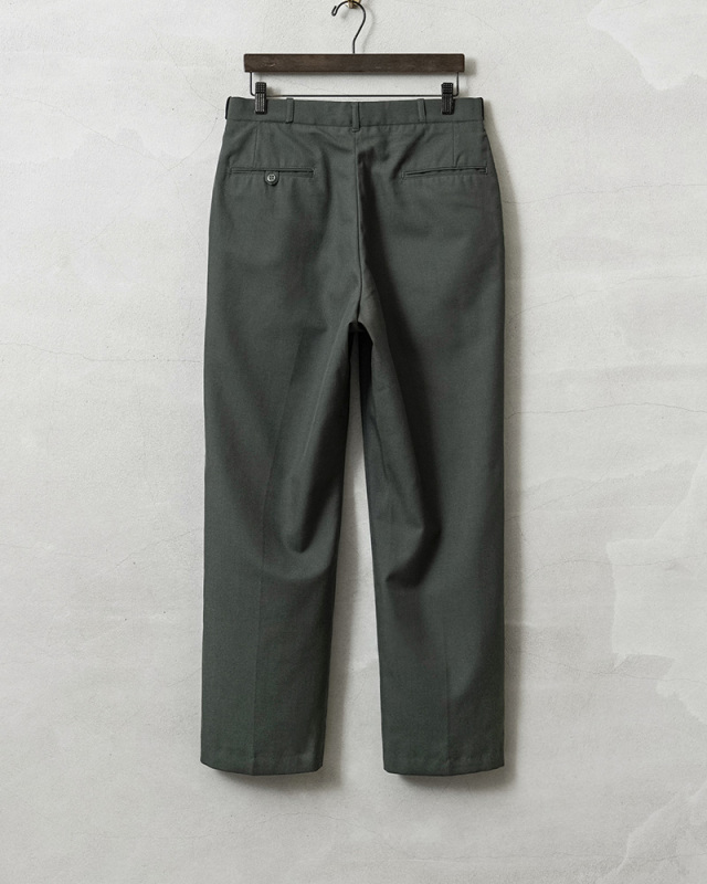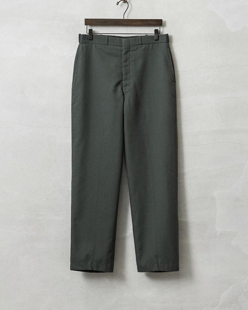 | 商品説明 | 実物 USED 米軍 AG344 サービス トラウザーズ 裾処理済みのご紹介です。 制式名称:TROUSERS,MEN’S POLYESTER WOOL SERGE, AG344 CLASS 6 1980年代頃から米陸軍で採用された、ポリエステル混のウールサージを使用したトラウザーズが入荷しました。 ウール100%の「AG44」から耐久性やシワ防止、軽量化などの改善が行われた「AG344」というより実用的な素材が使用されたモデルです。アーミーグリーンカラーのクラシックな雰囲気漂うアイテムで、正装時や常装として着用するサービストラウザーズです。 ポリエステル混のウールサージは、ウールの保温性やポリエステルの強度、シワ耐性を両立した、耐久性の高い綾織り生地です、チクチク感を感じることもなく、綾織りの上質な素材感で風合い良く仕上がっています。 ウールは保温性と通気性を併せ持ち、寒い季節は暖かく、暑い季節でも快適に着用できる素材です。さらに、天然由来の抗菌・防臭効果を備えています。フロントはヴィンテージ感漂うブラスジッパーを使用、ストレートに近いわずかにテーパードしたシルエットです。 両サイドにはスラッシュポケット、両玉縁のバックポケットは左ポケットのみボタン留めの仕様です。彩度低めなアーミーグリーンで、日常使いからきれいめなスタイルまで幅広く対応する、汎用性の高い一本です。 |
