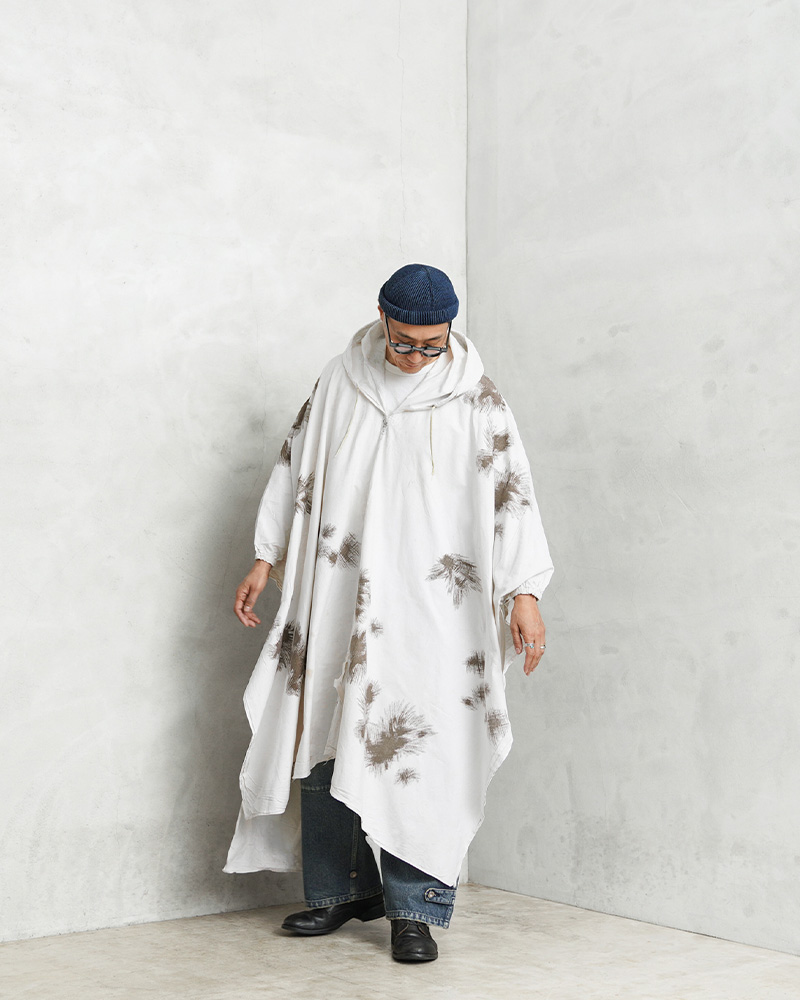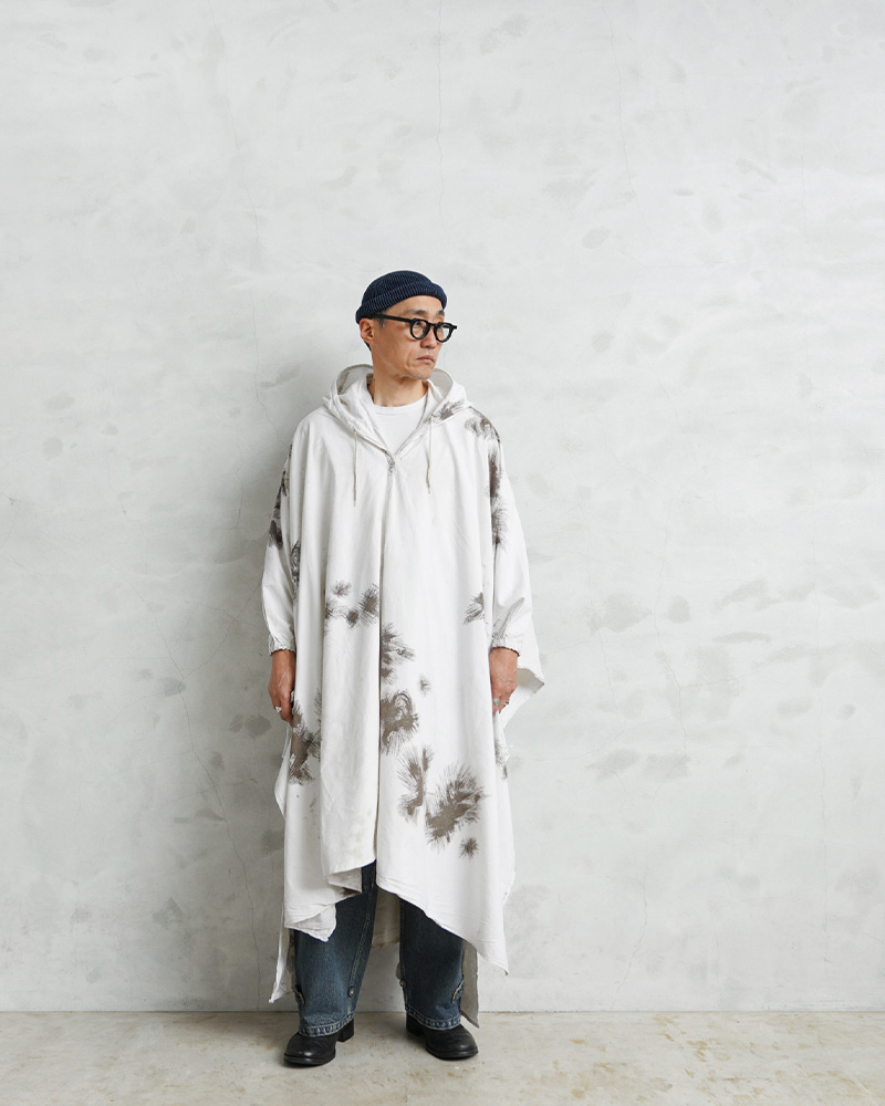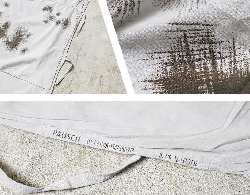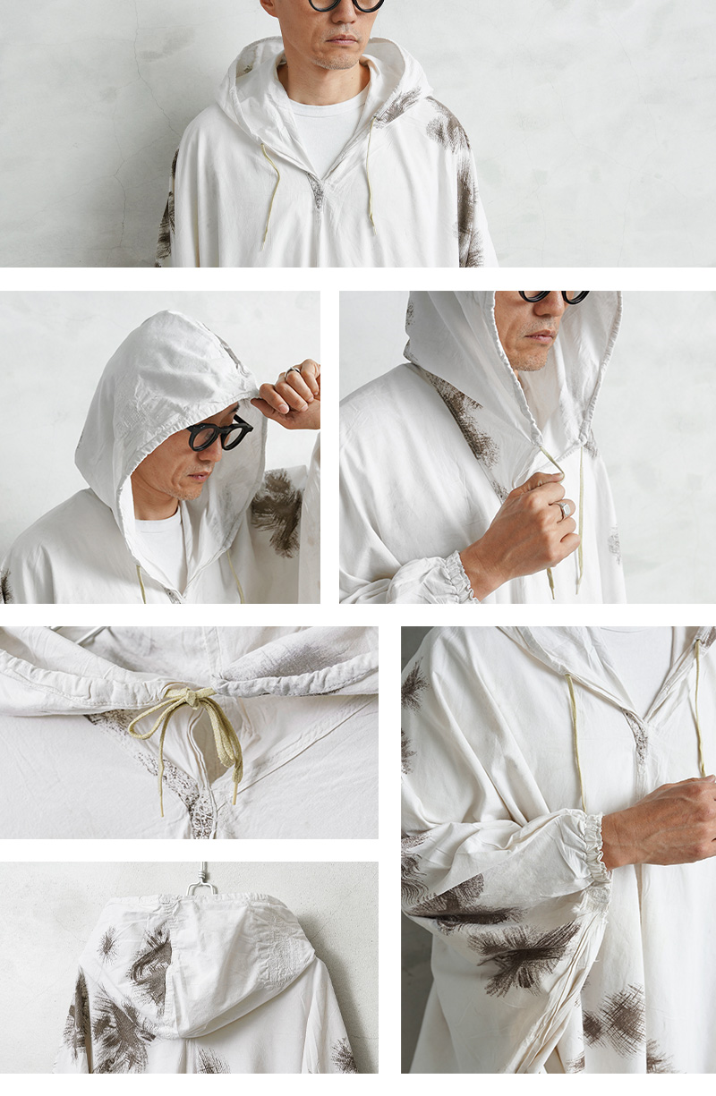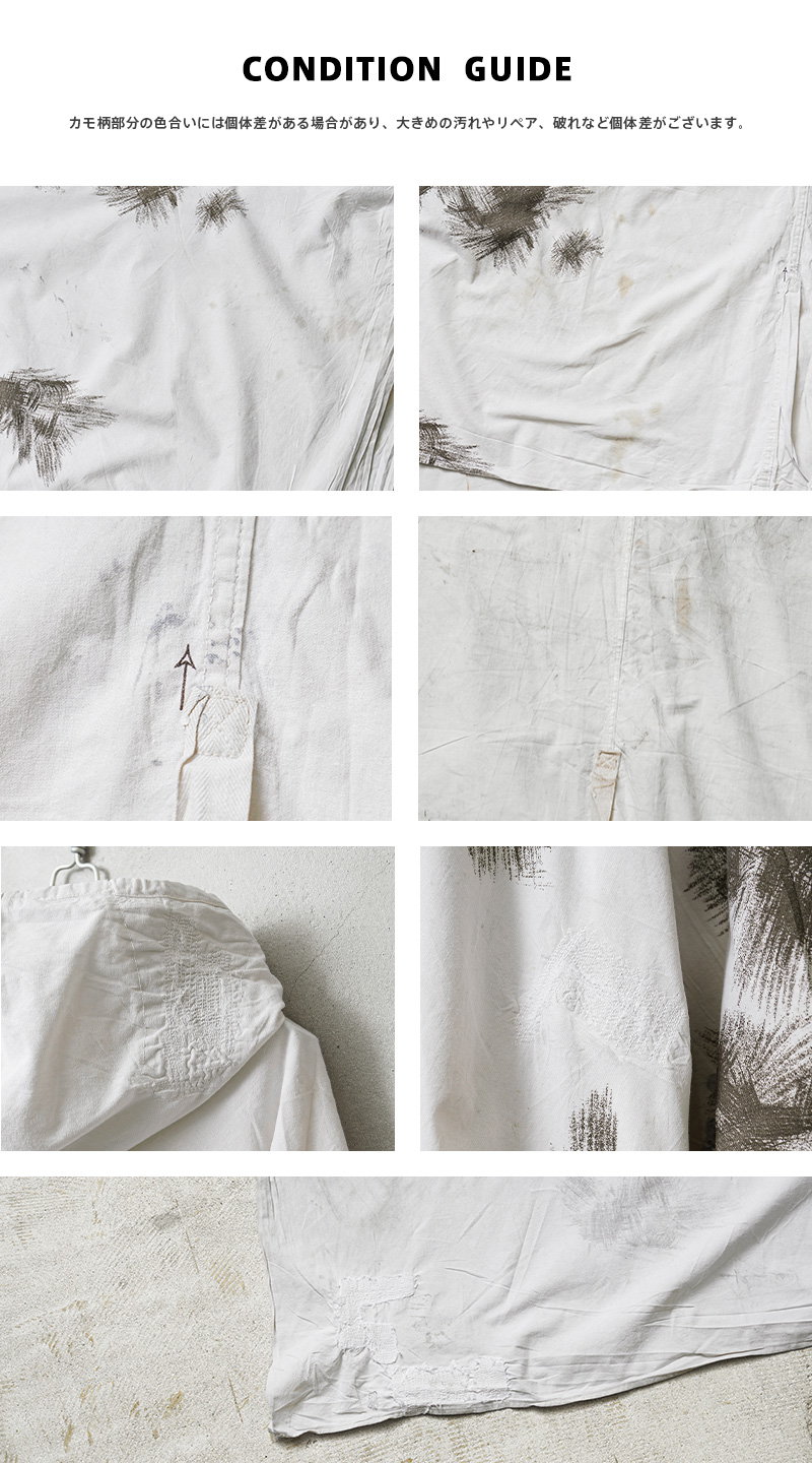 | 商品説明 | 実物 USED ドイツ軍 スノーカモ ポンチョ コンディションBのご紹介です。 1960年代に採用されたドイツ軍の雪上迷彩ポンチョが入荷しました。 雪上でカモフラージュする為に開発されており、白地に、欧米で一般に「パインリーフカモ」と呼称される棘のある葉のような柄が印象的。松葉のような模様は、雪に覆われた木々や冬の植生に効果的なカモパターンです。 本来、着用している衣服の上から被るポンチョで、身動きしやすく、その他様々な事に使用出来る様に大きめに作られています。サイドに2箇所、フロント、バック裾上にそれぞれ1箇所ずつ紐が付いているので自由自在に形を変形可能。フード部分はドローコードで絞ることができ、袖口にもしっかりと補強が入っています。 今ではほとんど見ることのできない色柄が目新しく新鮮。コットン生地の軽い着心地でライトアウターとしてはもちろん、さっと羽織るだけで周りと差が付くコーディネートのアクセントとしてもおススメです。 人気の高いユーロミリタリーアイテムの中でも希少で、コレクションとしても見逃せないアイテムです。 |