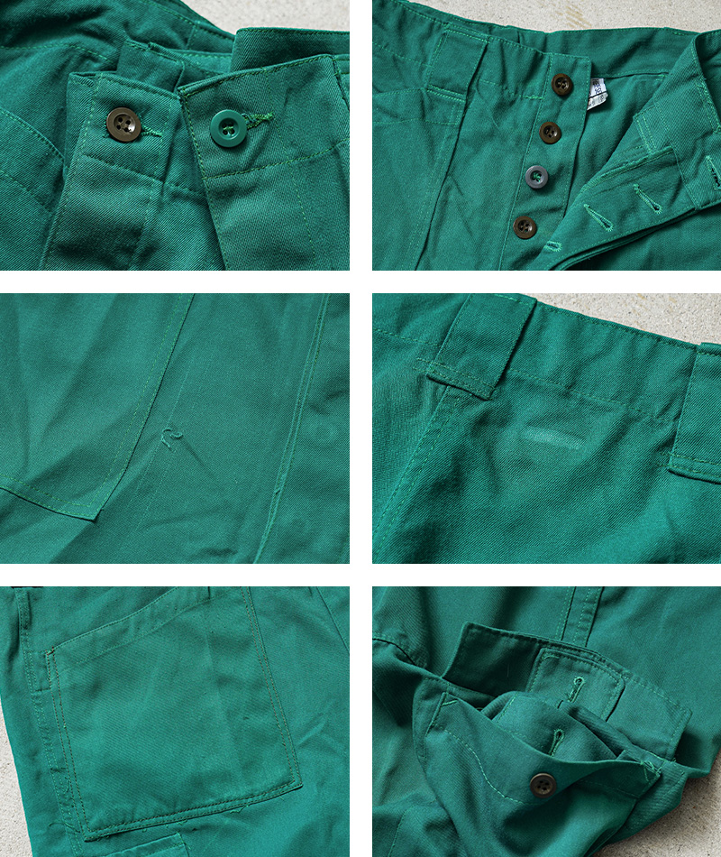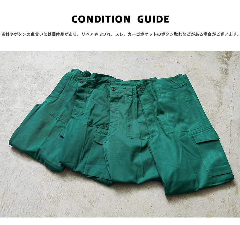| 商品説明 | 実物 USED オーストリア軍 CIVIL DEFENSE ファティーグ カーゴパンツ TEAL GREENのご紹介です。 オーストリア陸軍が所有する装備であることを表す「HEERESEIGENTUM」という記載がされた、オーストリア軍が関連するCIVIL DEFENSE(民間防衛)や、戦闘に関連しない整備や後方支援などの用途で使用された青みがかった鮮やかなグリーンのカーゴパンツです。 年代に関しては1980年代前後が多く入荷している印象です。オーストリア軍でも同じデザインのカーゴパンツは存在しますので、戦闘以外のワークウェアとして使用されていたことが推測されます。 ミリタリーテイストを感じさせる要素が多く盛り込まれているデザインで、柔らかでしっかりとしたツイル素材が採用されています。ポケットのデザインも他国のファティーグパンツにはない珍しいパッチポケットの形状で、一目でオーストリア軍と分かる特徴的なデザインです。 素材にはポリエステルとビスコースの混紡素材が使用されています。ビスコースはレーヨン素材の一種です。もとは人工シルクとして作られた素材で、木材や竹などの天然パルプに含まれる繊維質を再生して作られた再生繊維です。ポリエステルが主に使用された素材のため丈夫で速乾性、耐久性に優れています。 幅広のベルトループやボタンフライ仕立てのフロント。裾にかけてテーパードしたシルエットとジャストからオーバーサイズまでどのサイズでもバランスよく履けるカーゴパンツとなっています。 |