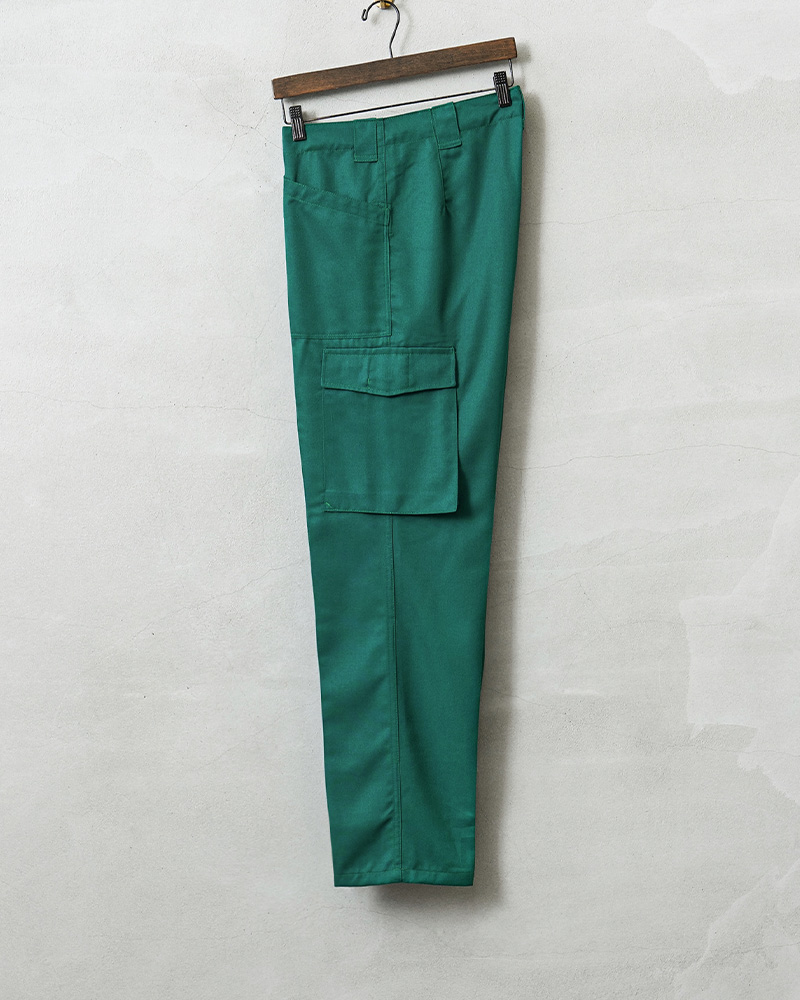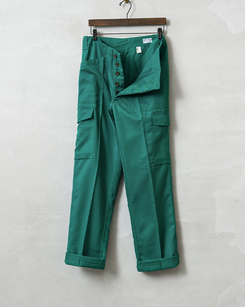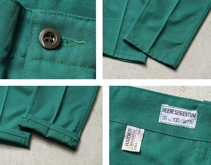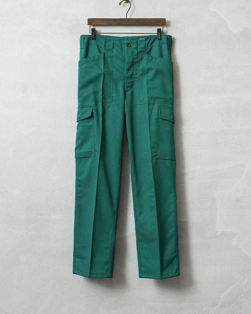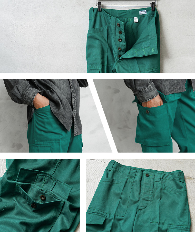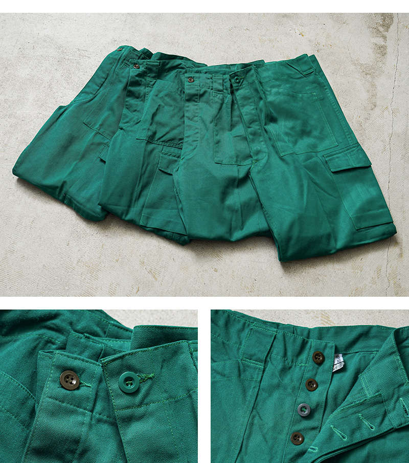 | 商品説明 | 実物 USED オーストリア軍 CIVIL DEFENSE ファティーグ カーゴパンツ TEAL GREEN コンディションBのご紹介です。 オーストリア陸軍が所有する装備であることを表す「HEERESEIGENTUM」という記載がされた、オーストリア軍が関連するCIVIL DEFENSE(民間防衛)や、戦闘に関連しない整備や後方支援などの用途で使用された青みがかった鮮やかなグリーンのカーゴパンツです。 年代に関しては1980年代前後が多く入荷している印象です。オーストリア軍でも同じデザインのカーゴパンツは存在しますので、戦闘以外のワークウェアとして使用されていたことが推測されます。 ミリタリーテイストを感じさせる要素が多く盛り込まれているデザインで、柔らかでしっかりとしたツイル素材が採用されています。ポケットのデザインも他国のファティーグパンツにはない珍しいパッチポケットの形状で、一目でオーストリア軍と分かる特徴的なデザインです。 素材にはポリエステルとビスコースの混紡素材が使用されています。ビスコースはレーヨン素材の一種です。もとは人工シルクとして作られた素材で、木材や竹などの天然パルプに含まれる繊維質を再生して作られた再生繊維です。ポリエステルが主に使用された素材のため丈夫で速乾性、耐久性に優れています。 幅広のベルトループやボタンフライ仕立てのフロント。裾にかけてテーパードしたシルエットとジャストからオーバーサイズまでどのサイズでもバランスよく履けるカーゴパンツとなっています。 |