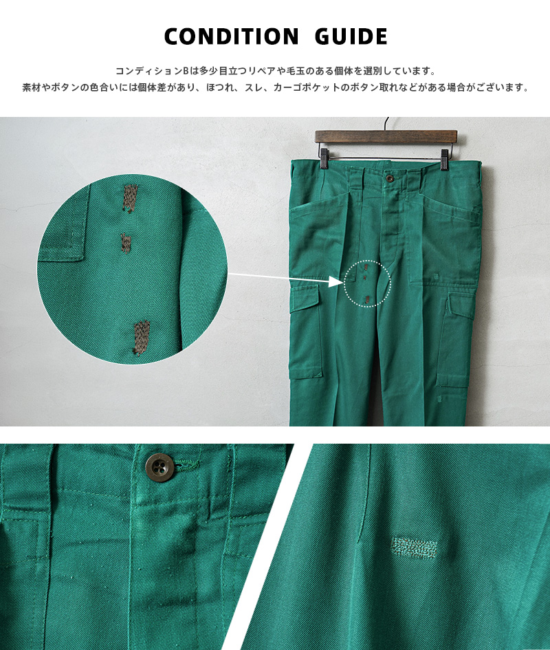 | 商品状態 | 軍放出のUSED ※コンディションBは多少目立つリペアや毛玉のある個体を選別しています。素材やボタンの色合いには個体差があり、ほつれ、スレ、カーゴポケットのボタン取れなどがある場合がございます。商品の状態についてご指定いただくことは出来ませんので予めご了承ください。 |